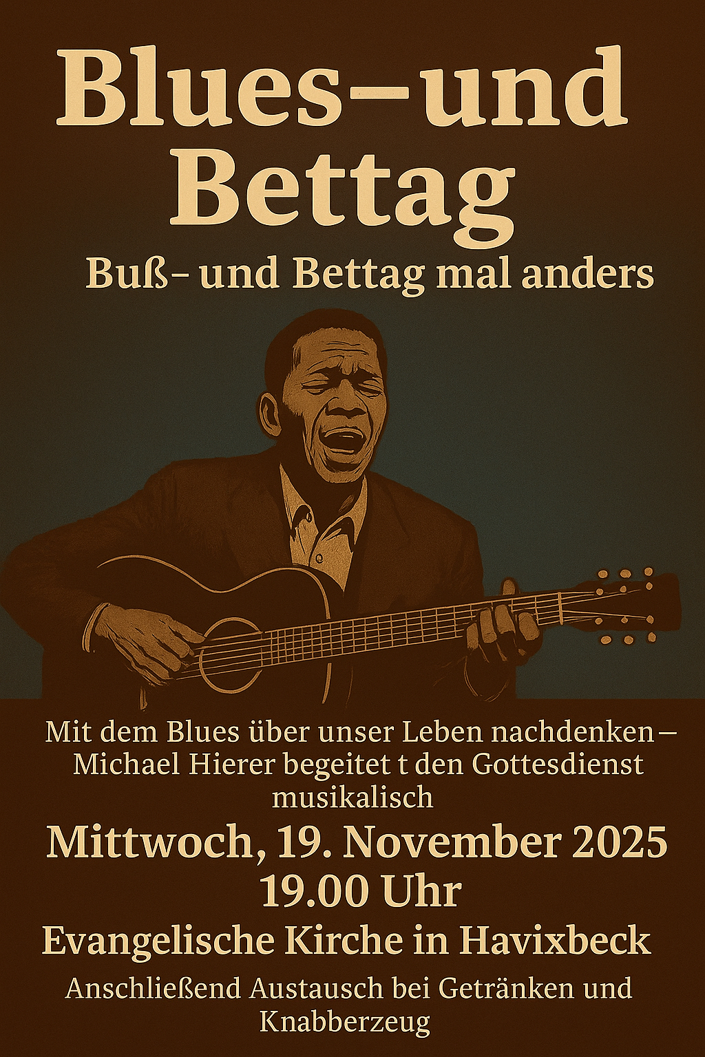 Am Buß- und Bettag möchten wir mit dem Blues über unser Leben nachdenken – über das, was uns belastet, was wir uns wünschen, und was wir vor Gott bringen möchten. Der Musiker Michael Hierer begleitet uns dabei musikalisch.