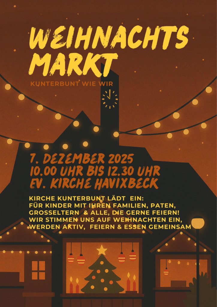 Am Sonntag, dem 07.12.2025 wird es von 10:00 – 12:30 Uhr weihnachtlich kunterbunt in der evangelischen Kirche an der Schulstraße 12.